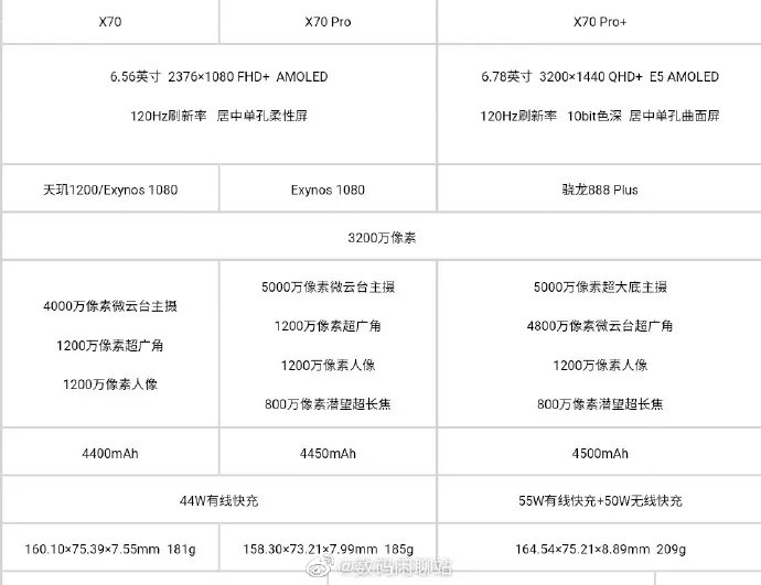 Weibo tipster Digital Chat Station published a table that detailed the specs of the Vivo X70 Pro Plus, X70 Pro, and the vanilla X70. The leak suggests that these phones will be shipped under the hood with MediaTek, Samsung, and Qualcomm chipsets.